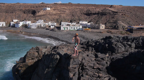 Slow motion of young man climbing rocky cliff at seashore. View from cliff top
