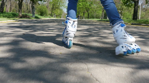 Close Ground View Of Legs Of Girls Turning On Roller Skates By Harbor