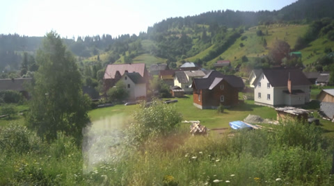 Trekkers exploring the countryside greenwoods within carpathian mountains. Tracking shot