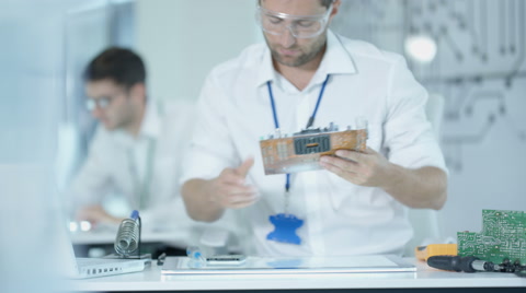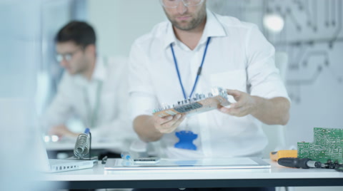 4K Electronics engineers working in the lab building & testing electronic devices. Shot on RED Epic.