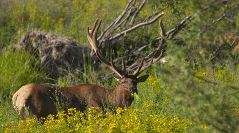 Elk grazing in a field.