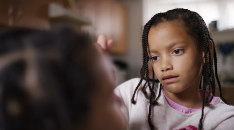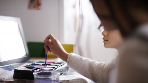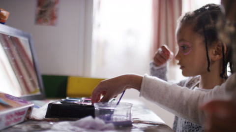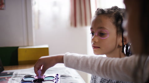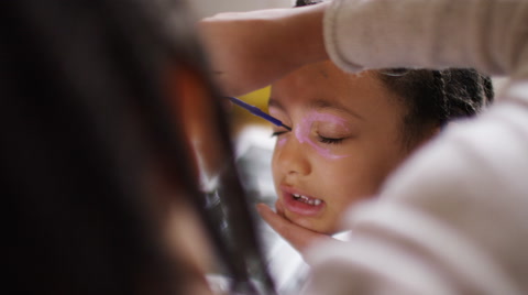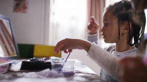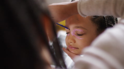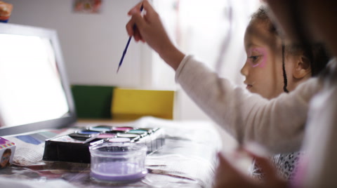 Slow motion clip of a young child concentrating as she paints the face of another child