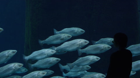 Two unrecognizable children watching fish swim by at aquarium