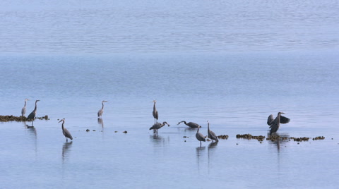 An eagle dives on a misty morning to catch a small fish. Herons look on.