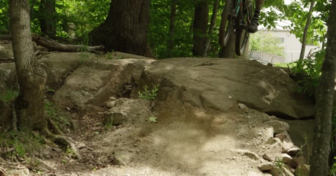 A young cyclist racing down a dirt hill on a robust mountain bike.