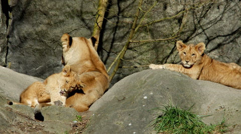 Lion cubs playing together.