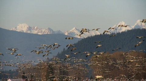 A large flock of Snow Geese in the distance over Puget Sound prepare to rest for the night.