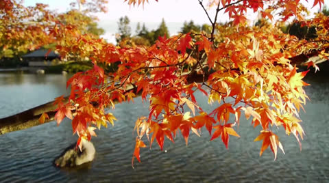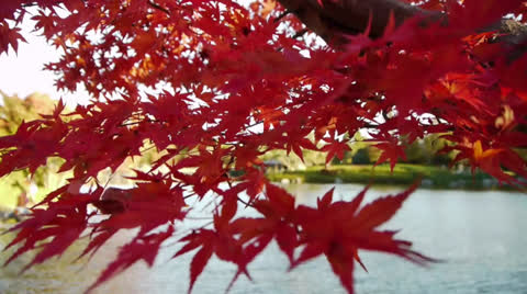 Footage of Japanese Maple in evening sun over pond in autumn in Japan