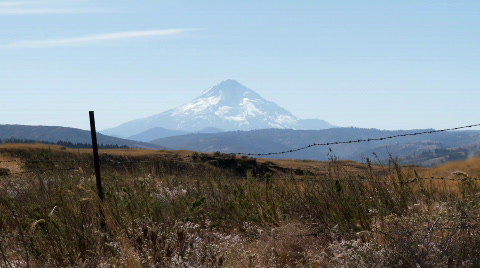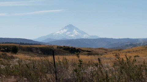 Mt Hood with Columbia river and railroad track in foreground.