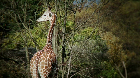 Close up of a giraffe's head from the side with black background.