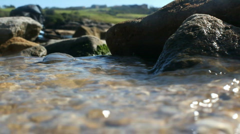 Small Stationary Waves Form in Freshwater Stream, Sandy Beach. Rainwater run-off heading to the ocean at dawm.