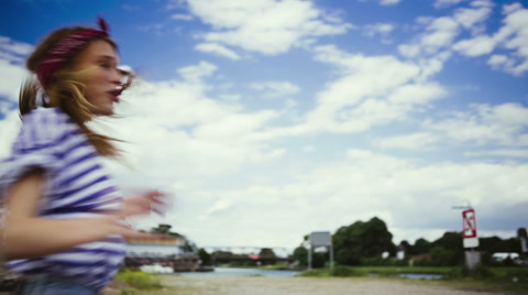 Hipster girl blowing bubbles towards camera in grunge urban area