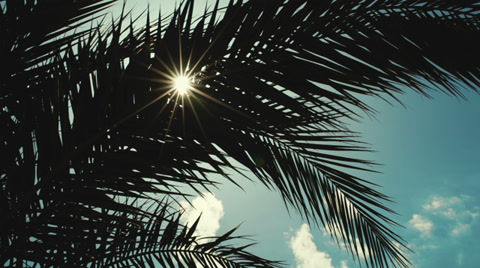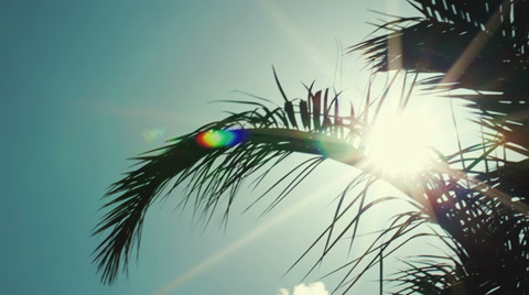 Scene of high palms with tops swinging in the wind against blue sky background