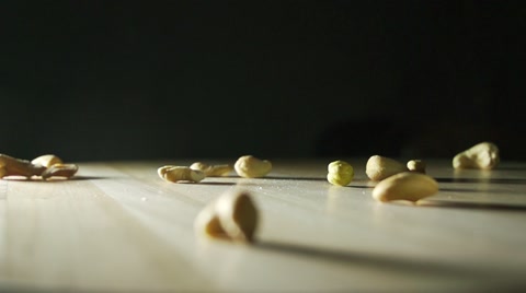 Cashew nuts and chickpeas falling on a wooden floor in slow motion