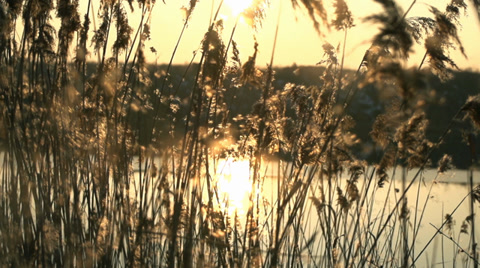 Bulrush seeds float in the air at sunset in slow motion