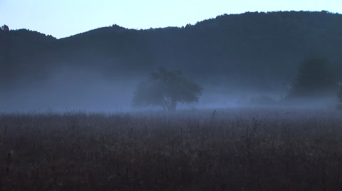 Sunrise behind the mountain mist spreads on the meadow,fog are stealth in meadow at sunrise(fast motion)
