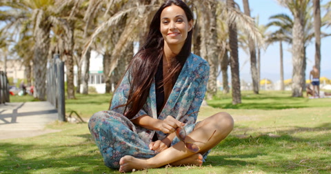 Adorable roller skate girl sitting at beach promenade. She wearing high red socks bikini yellow skimpy shirt and sunglasses. All in slow motion video